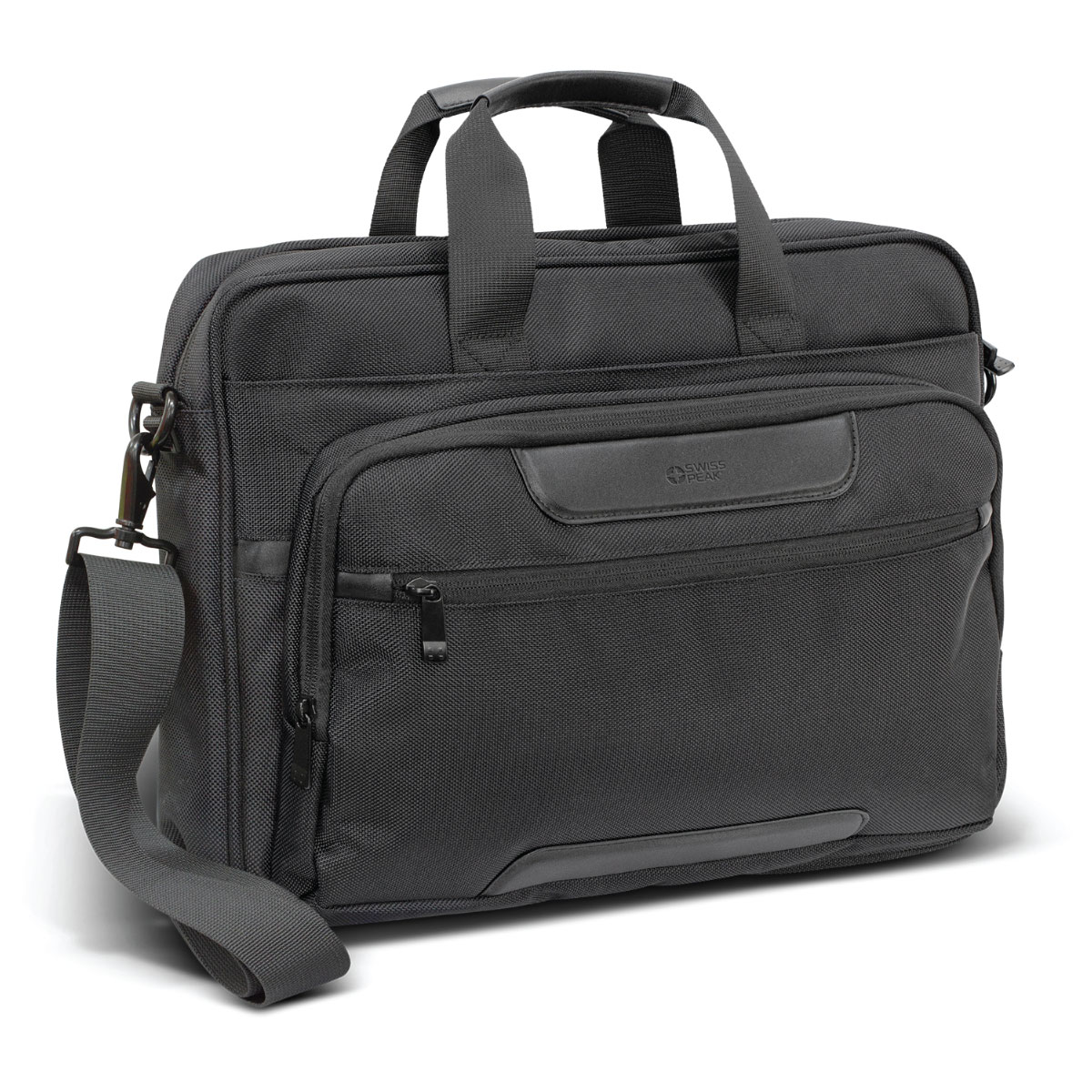 Introducing the Swiss Peak Premium Laptop Satchels, an embodiment of sophistication and utility that will undoubtedly leave a lasting impression on your esteemed clients and dedicated staff. Through meticulous craftsmanship, this satchel conveys an unparalleled sense of elegance, underlined by the bespoke touch of your logo adorning its surface. Impeccably fashioned from resilient 1680D polyester with refined PU accents, and lined with 210D polyester, this satchel amalgamates enduring quality with an aesthetic appeal. Boasting specialized compartments, including RFID-protected pockets and a cushioned laptop enclave, along with the convenience of multiple carrying options – be it the ergonomic handles, padded shoulder strap, or the convenience of a rear luggage sleeve.