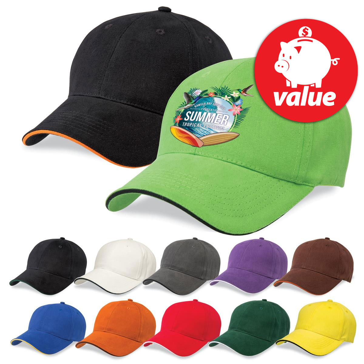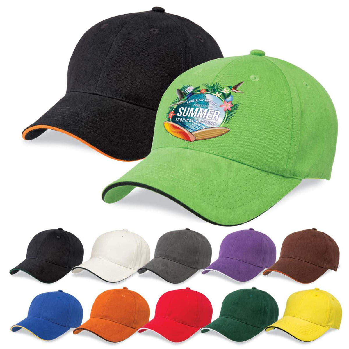Featuring the iconic "sandwich" style peak these premium cotton caps offer a prominent display of your logo when worn. They are suited for casual wear or can be included in a uniform or used at events to identify staff and volunteers. The caps themselves have a 6-panel design with a slight pre-curved peak, a velcro closure, embroidered eyelets and a comfortable padded sweatband. We suggest an embroidery or maxiCOLOUR print for decoration.