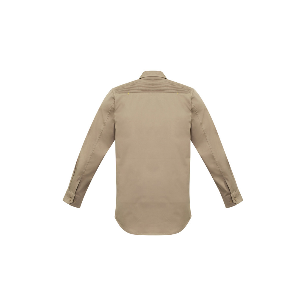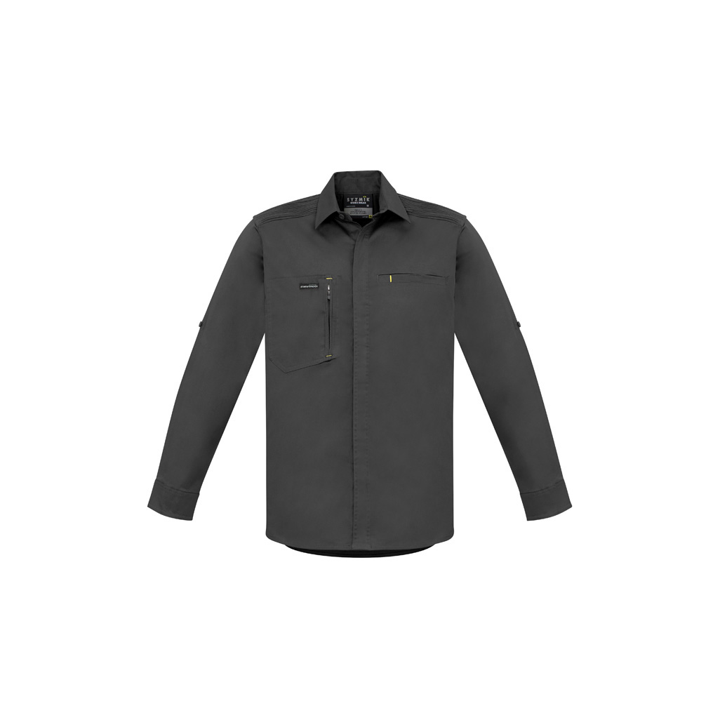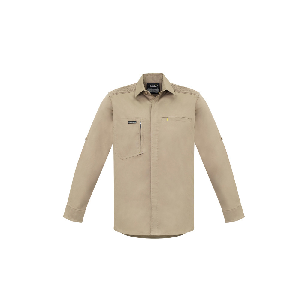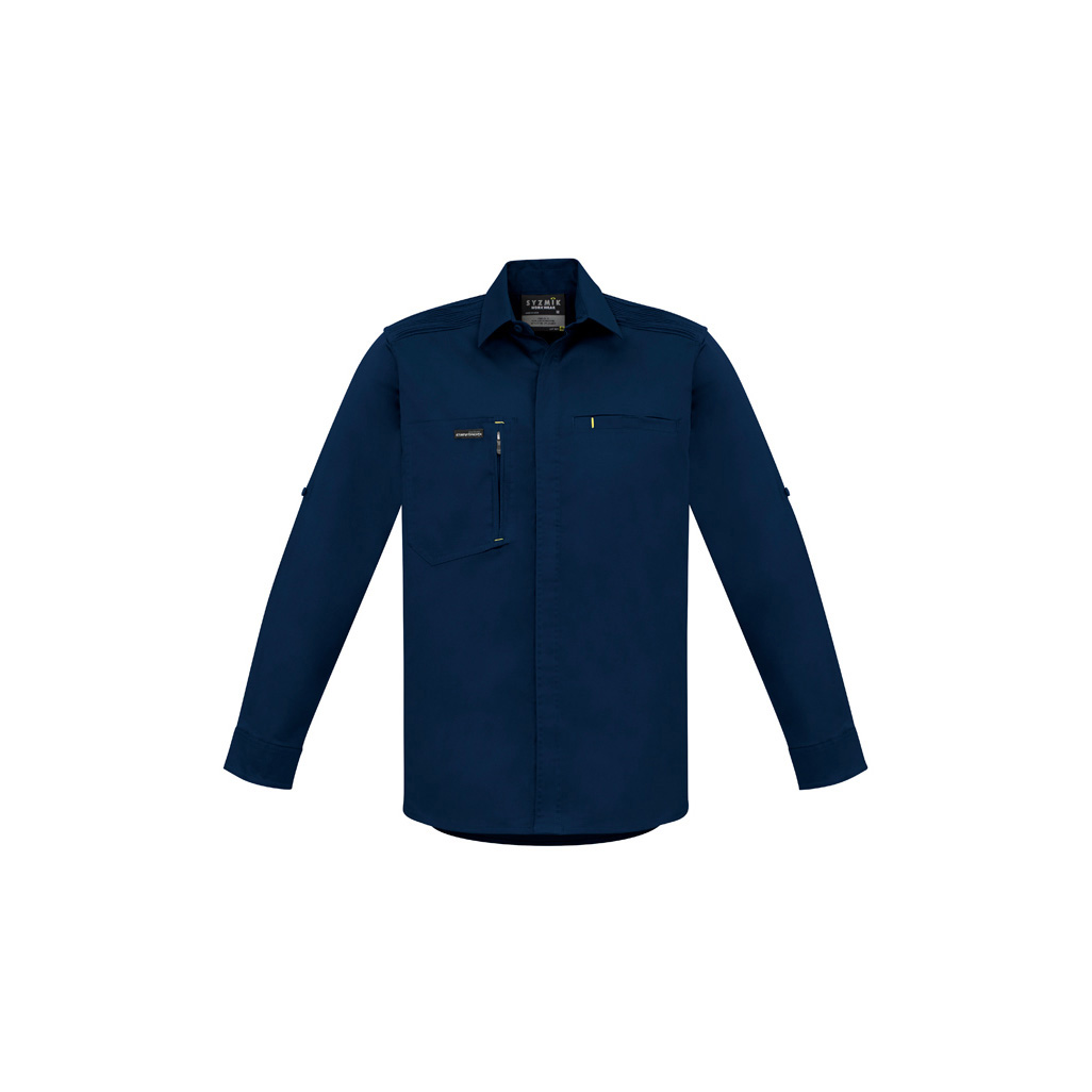 Constructed from a combination of cotton and spandex material in 150gsm making it soft and lightweight, but cool and durable the same time. Features a roll up tab sleeves, unique stretch pleating across the shoulder to provide movement and reinforcement for carrying items over the shoulder, modern slim fit, 1 zip chest pocket for secure easy access, and 1 chest pocket with pen partition & quick close tape.