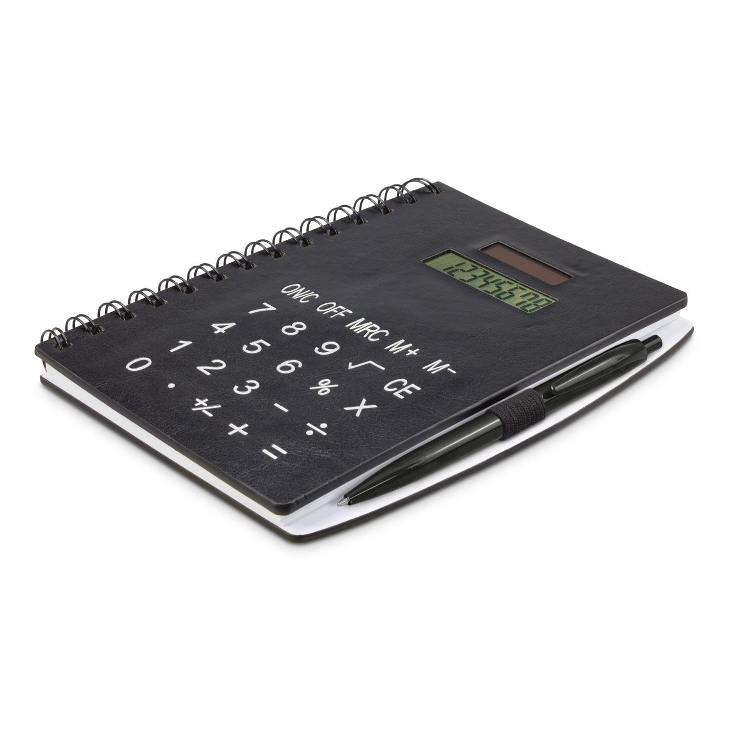 Notebook Calculators is great promotional item to any conference. The notebook is medium size with a hard cover and contains 70 lined leaves (140 pages), with a wiro binding and an elastic pen loop with plastic pen included! The calculator is solar powered and usable on the front cover.