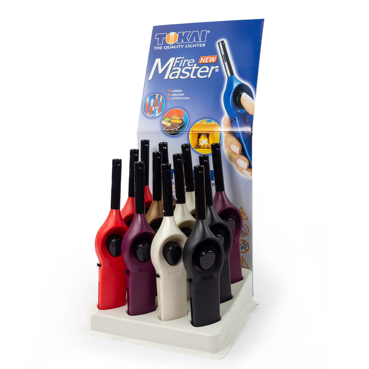 The TOKAI Fire Master BBQ lighter is available in packs of 4 assorted colours (white, black, red, blue). They can be refilled and are suitable for BBQs, starting wood fires, gas grills, pilot lights and more. Due to only being sold in assorted colours the print colour much be visible on all colours (ask us for suggestions). All lighters are sold in display stands and include a lock-in safety catch for added safety. Please note image shown is an example, colours may vary.