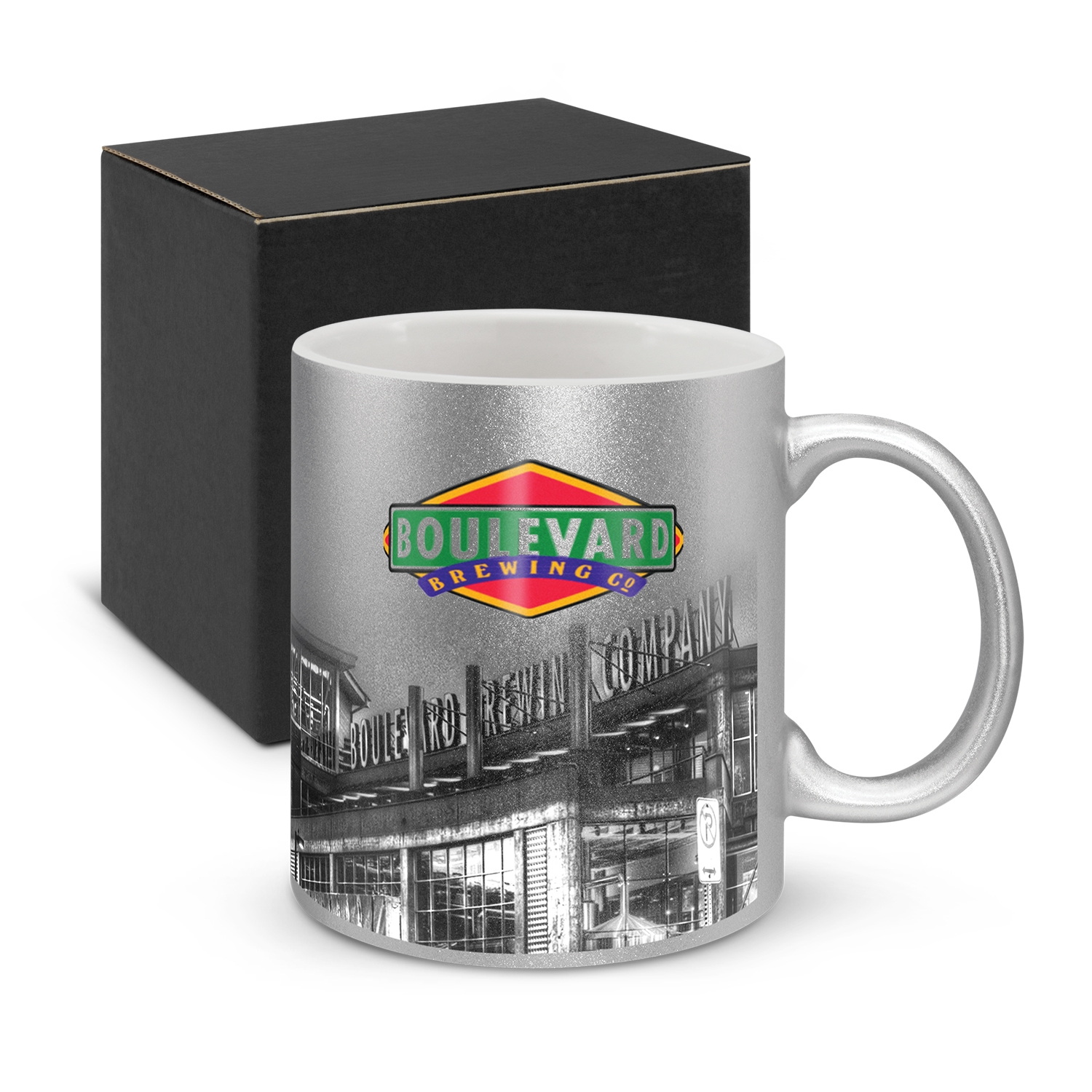 A modern, fashionable, round stoneware 330ml capacity coffee mug with D style handle is just the right mug for someone who loves metallic features. It comes with a matt silver finish that produces a metallic effect and can be designed your own logo. This mug is also presented in a black gift box.