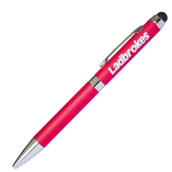 Metal Skye Pens is a modern pen with so many matt colours available to choose from. These stylish rubberised stylus pens make for an amazing promo pen. They feature a twist-action build with a black stylus and a shiny chrome trim accent for that premium look. It has 1800m of black Dokumental writing ink and a tungsten carbide nib for improved quality writing. Please note maxiCOLOUR print only available on quantities 250 and above.