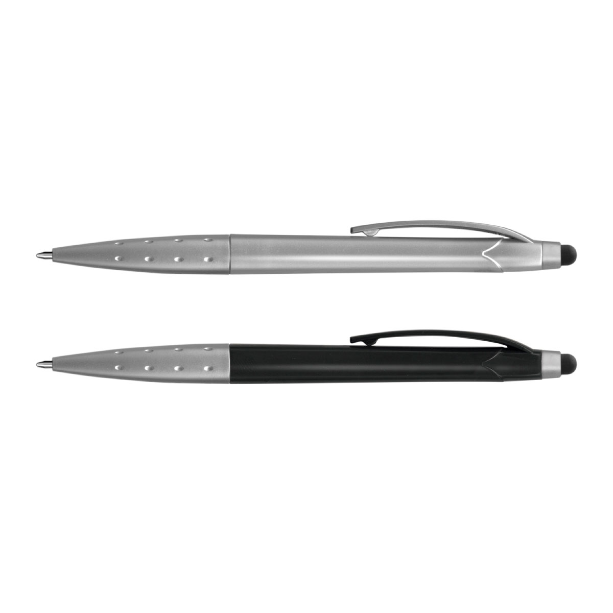 Twist action with a metallic barrel, these plastic ball pens feature a stylus for use with touch screens. They have a black ink refill with 500m of writing distance and a tungsten carbide ball for improved writing quality.