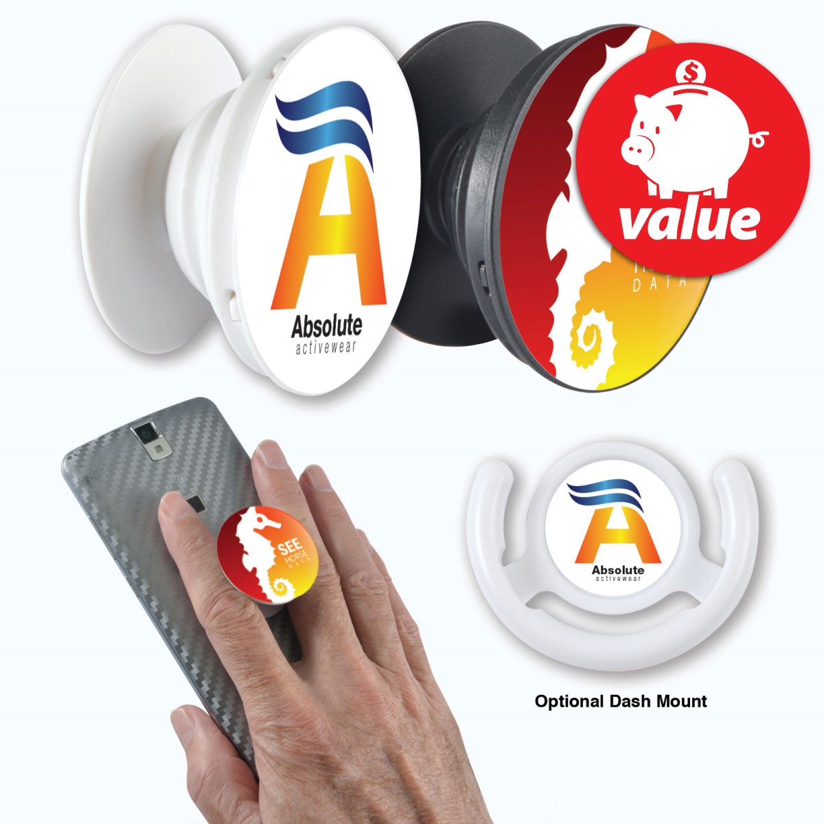 Get a grip on your marketing with these low-cost phone grips. They're the perfect way to snap selfies, and watch videos on your phone and they make your phone easier to hold, greatly reducing the chance of dropping and smashing your phone screen. The grip easily attaches to the back of your phone or case and sits flat when not in use or expand up when needed. Optional dashboard mount is also available for an additional cost. Can be packaged in a cello bag or for an additional cost with a full-colour printed backing card.